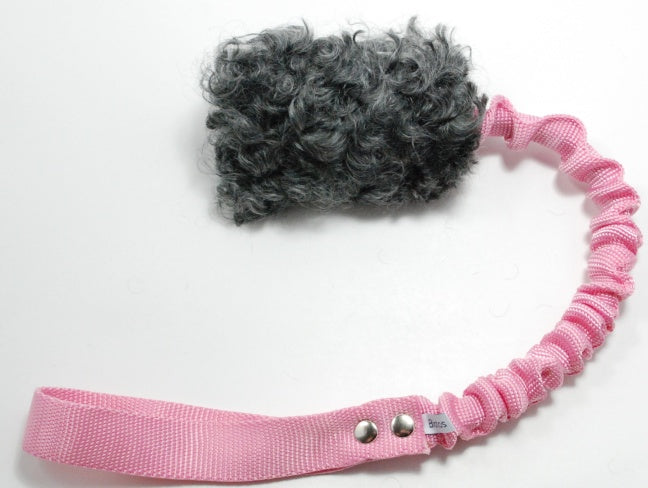 Fårskinnsleksak med pip. Expanderbandet är ca 40 cm långt inkl handtaget, fastsytt i båda ändarna. Handtaget finns i rosa & svart.