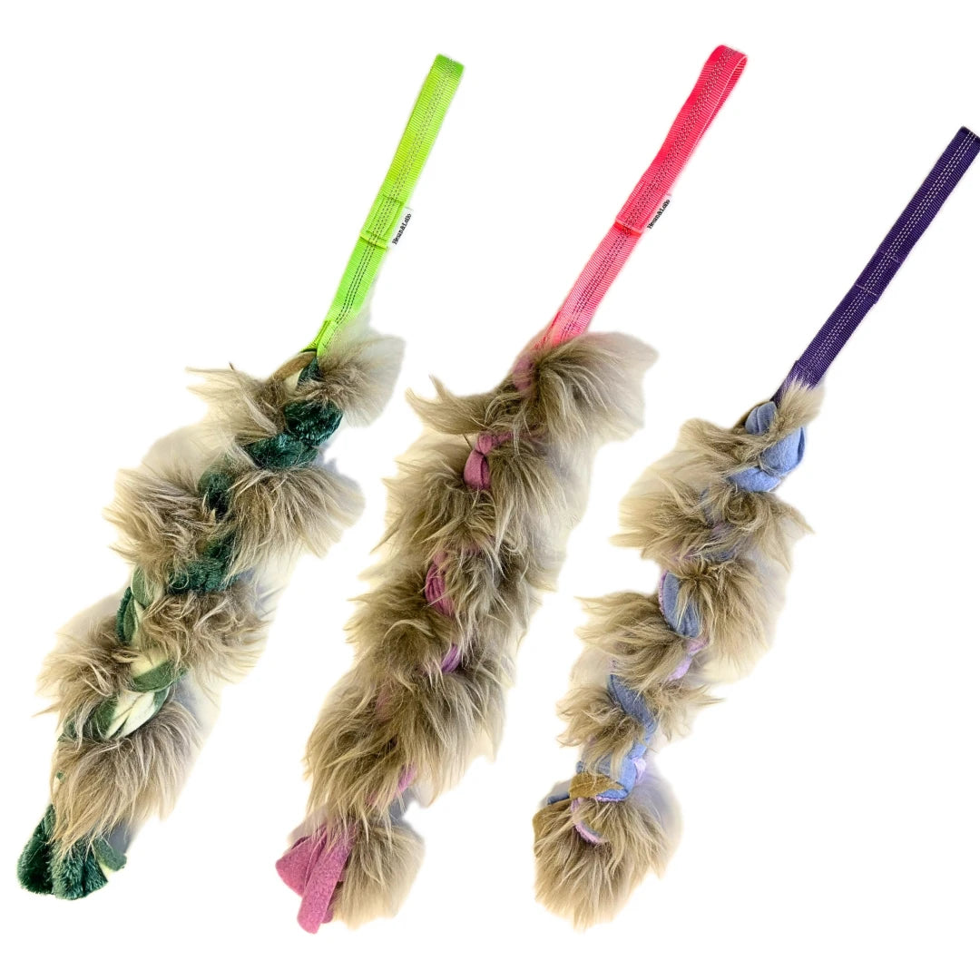 Ge din hund en rolig och stimulerande lekstund med vår svensktillverkade kampleksak från Hesan&Lollo! Denna handgjorda leksak är tillverkad av äkta fårskinn flätat tillsammans med mjuk fleece, vilket skapar en oemotståndlig kombination av doft och textur – perfekt för både belöningslek och träning.