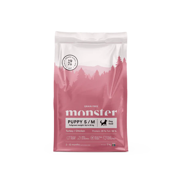 Monster Dog Puppy Small & Medium Chicken & Turkey är ett helfoder anpassat för valpar 2-12 månader av små och medelstora raser. Fodret är ett glutenfritt valpfoder av superpremiumkvalitet, med kyckling och kalkon som huvudingredienser.