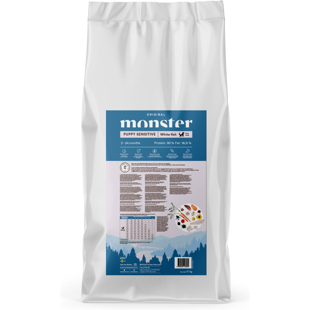 Monster Dog Puppy Sensitive White Fish, är ett komplett glutenfritt torrfoder, skräddarsydd för valpar med känslig mage. Torrfodret innehåller ingredienser såsom vit fisk och mild havre, som lugnar och skonar valpens mage.
